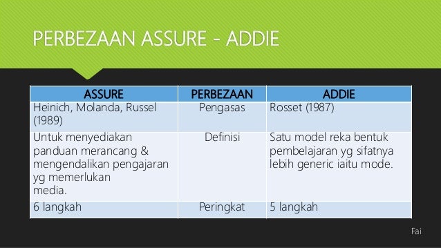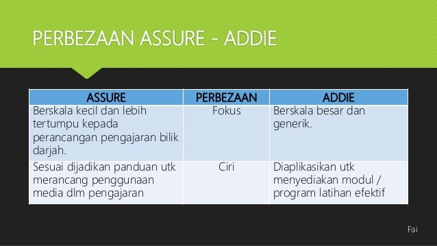 10. PERBEZAAN ASSURE - ADDIE ASSURE PERBEZAAN ADDIE Berskala kecil dan lebih tertumpu kepada perancangan pengajaran bilik darjah. Fokus Berskala besar dan generik. Sesuai dijadikan panduan utk merancang penggunaan media dlm pengajaran Ciri Diaplikasikan utk menyediakan modul / program latihan efektif Fai