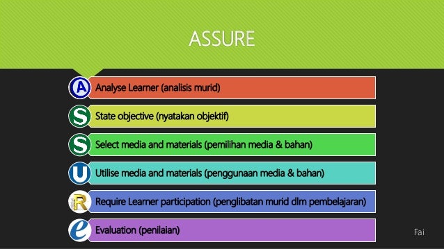 11. ASSURE Analyse Learner (analisis murid) State objective (nyatakan objektif) Select media and materials (pemilihan media & bahan) Utilise media and materials (penggunaan media & bahan) Require Learner participation (penglibatan murid dlm pembelajaran) Evaluation (penilaian) Fai