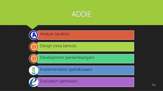 12. ADDIE Analyse (analisis) Design (reka bentuk) Development (perkembangan) Implementation (perlaksaaan) Evaluation (penilaian) Fai