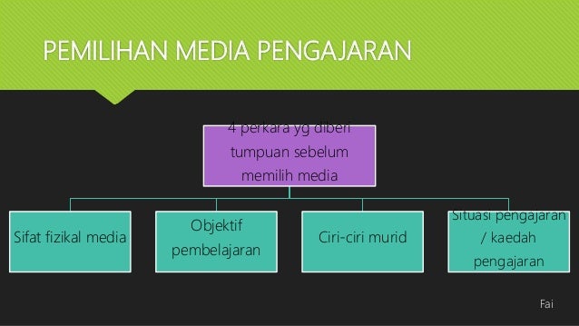 13. PEMILIHAN MEDIA PENGAJARAN 4 perkara yg diberi tumpuan sebelum memilih media Situasi pengajaran / kaedah pengajaran Ciri-ciri murid Objektif pembelajaran Sifat fizikal media Fai