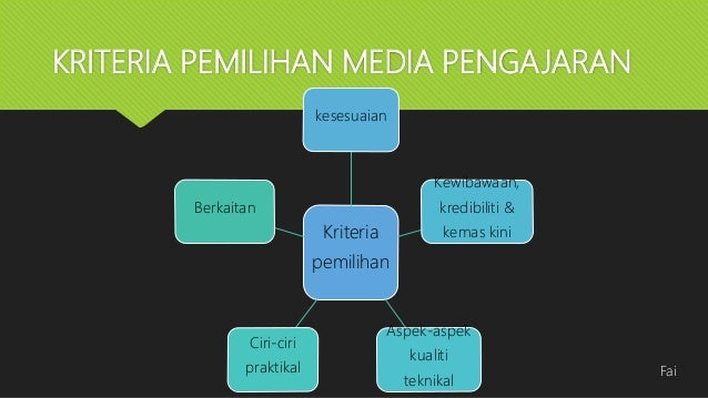 14. KRITERIA PEMILIHAN MEDIA PENGAJARAN Kriteria pemilihan kesesuaian Kewibawaan, kredibiliti & kemas kini Aspek-aspek kualiti teknikal Ciri-ciri praktikal Berkaitan Fai