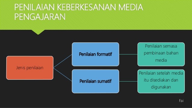 16. PENILAIAN KEBERKESANAN MEDIA PENGAJARAN Jenis penilaian Penilaian formatif Penilaian semasa pembinaan bahan media Penilaian sumatif Penilaian setelah media itu disediakan dan digunakan Fai
