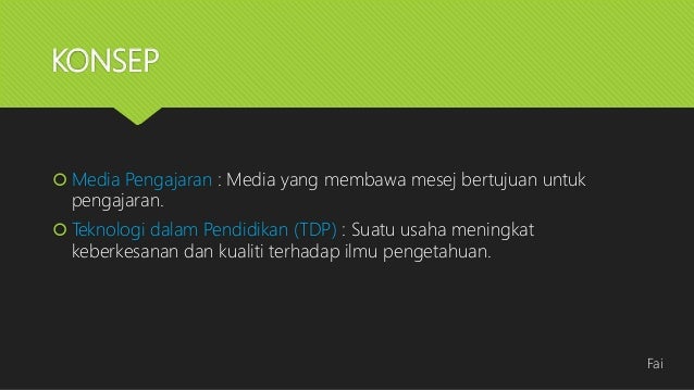 3. KONSEP Media Pengajaran : Media yang membawa mesej bertujuan untuk pengajaran. Teknologi dalam Pendidikan (TDP) : Suatu usaha meningkat keberkesanan dan kualiti terhadap ilmu pengetahuan. Fai