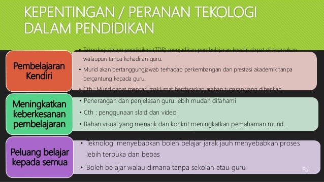 4. KEPENTINGAN / PERANAN TEKOLOGI DALAM PENDIDIKAN • Teknologi dalam pendidikan (TDP) menjadikan pembelajaran kendiri dapat dilaksanakan walaupun tanpa kehadiran guru. • Murid akan bertanggungjawab terhadap perkembangan dan prestasi akademik tanpa bergantung kepada guru. • Cth : Murid dapat mencari maklumat berdasarkan arahan tugasan yang diberikan. Pembelajaran Kendiri • Penerangan dan penjelasan guru lebih mudah difahami • Cth : penggunaan slaid dan video • Bahan visual yang menarik dan konkrit meningkatkan pemahaman murid. Meningkatkan keberkesanan pembelajaran • Teknologi menyebabkan boleh belajar jarak jauh menyebabkan proses lebih terbuka dan bebas • Boleh belajar walau dimana tanpa sekolah atau guru Peluang belajar kepada semua Fai