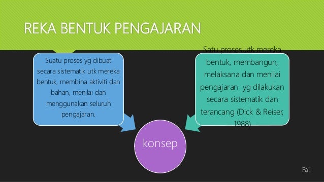6. REKA BENTUK PENGAJARAN konsep Suatu proses yg dibuat secara sistematik utk mereka bentuk, membina aktiviti dan bahan, menilai dan menggunakan seluruh pengajaran. Satu proses utk mereka bentuk, membangun, melaksana dan menilai pengajaran yg dilakukan secara sistematik dan terancang (Dick & Reiser, 1988) Fai