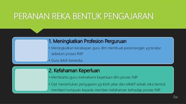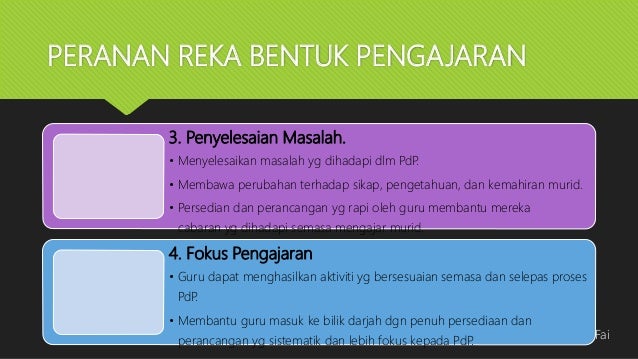 8. PERANAN REKA BENTUK PENGAJARAN 3. Penyelesaian Masalah. • Menyelesaikan masalah yg dihadapi dlm PdP. • Membawa perubahan terhadap sikap, pengetahuan, dan kemahiran murid. • Persedian dan perancangan yg rapi oleh guru membantu mereka cabaran yg dihadapi semasa mengajar murid. 4. Fokus Pengajaran • Guru dapat menghasilkan aktiviti yg bersesuaian semasa dan selepas proses PdP. • Membantu guru masuk ke bilik darjah dgn penuh persediaan dan perancangan yg sistematik dan lebih fokus kepada PdP. Fai
