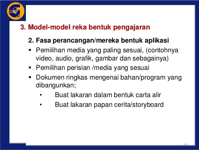 - 18. 2. Fasa perancangan/mereka bentuk aplikasi Pemilihan media yang paling sesuai, (contohnya video, audio, grafik, gambar dan sebagainya) Pemilihan perisian /media yang sesuai Dokumen ringkas mengenai bahan/program yang dibangunkan; • Buat lakaran dalam bentuk carta alir • Buat lakaran papan cerita/storyboard 18 3. Model-model reka bentuk pengajaran