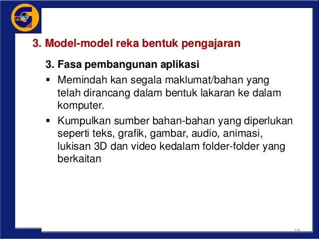 - 19. 3. Fasa pembangunan aplikasi Memindah kan segala maklumat/bahan yang telah dirancang dalam bentuk lakaran ke dalam komputer. Kumpulkan sumber bahan-bahan yang diperlukan seperti teks, grafik, gambar, audio, animasi, lukisan 3D dan video kedalam folder-folder yang berkaitan 19 3. Model-model reka bentuk pengajaran