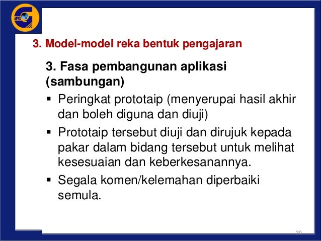 - 20. 3. Fasa pembangunan aplikasi (sambungan) Peringkat prototaip (menyerupai hasil akhir dan boleh diguna dan diuji) Prototaip tersebut diuji dan dirujuk kepada pakar dalam bidang tersebut untuk melihat kesesuaian dan keberkesanannya. Segala komen/kelemahan diperbaiki semula. 20 3. Model-model reka bentuk pengajaran