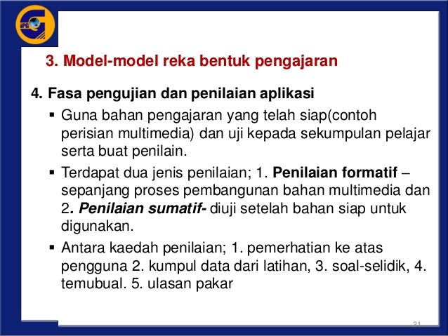 - 21. 4. Fasa pengujian dan penilaian aplikasi Guna bahan pengajaran yang telah siap(contoh perisian multimedia) dan uji kepada sekumpulan pelajar serta buat penilain. Terdapat dua jenis penilaian; 1. Penilaian formatif – sepanjang proses pembangunan bahan multimedia dan 2. Penilaian sumatif- diuji setelah bahan siap untuk digunakan. Antara kaedah penilaian; 1. pemerhatian ke atas pengguna 2. kumpul data dari latihan, 3. soal-selidik, 4. temubual. 5. ulasan pakar 21 3. Model-model reka bentuk pengajaran