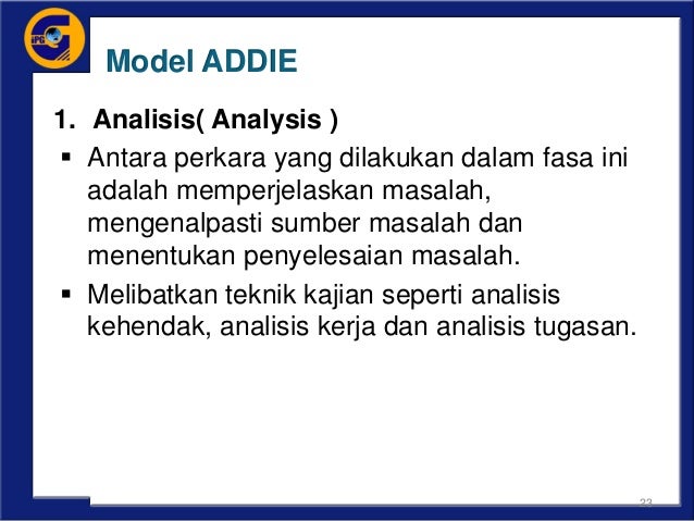 - 23. Model ADDIE 1. Analisis( Analysis ) Antara perkara yang dilakukan dalam fasa ini adalah memperjelaskan masalah, mengenalpasti sumber masalah dan menentukan penyelesaian masalah. Melibatkan teknik kajian seperti analisis kehendak, analisis kerja dan analisis tugasan. 23