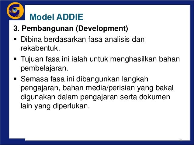 - 25. Model ADDIE 3. Pembangunan (Development) Dibina berdasarkan fasa analisis dan rekabentuk. Tujuan fasa ini ialah untuk menghasilkan bahan pembelajaran. Semasa fasa ini dibangunkan langkah pengajaran, bahan media/perisian yang bakal digunakan dalam pengajaran serta dokumen lain yang diperlukan. 25