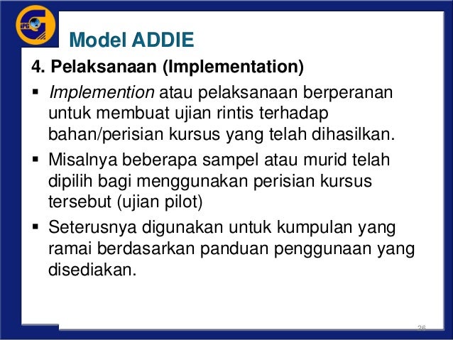 - 26. Model ADDIE 4. Pelaksanaan (Implementation) Implemention atau pelaksanaan berperanan untuk membuat ujian rintis terhadap bahan/perisian kursus yang telah dihasilkan. Misalnya beberapa sampel atau murid telah dipilih bagi menggunakan perisian kursus tersebut (ujian pilot) Seterusnya digunakan untuk kumpulan yang ramai berdasarkan panduan penggunaan yang disediakan. 26