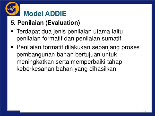 - 27. Model ADDIE 5. Penilaian (Evaluation) Terdapat dua jenis penilaian utama iaitu penilaian formatif dan penilaian sumatif. Penilaian formatif dilakukan sepanjang proses pembangunan bahan bertujuan untuk meningkatkan serta memperbaiki tahap keberkesanan bahan yang dihasilkan. 27