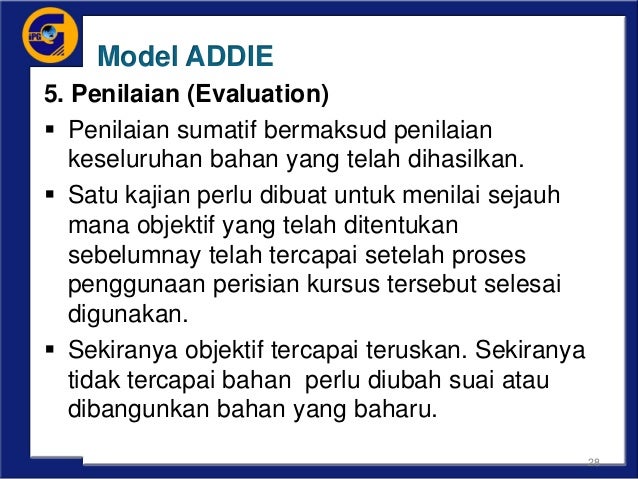 - 28. Model ADDIE 5. Penilaian (Evaluation) Penilaian sumatif bermaksud penilaian keseluruhan bahan yang telah dihasilkan. Satu kajian perlu dibuat untuk menilai sejauh mana objektif yang telah ditentukan sebelumnay telah tercapai setelah proses penggunaan perisian kursus tersebut selesai digunakan. Sekiranya objektif tercapai teruskan. Sekiranya tidak tercapai bahan perlu diubah suai atau dibangunkan bahan yang baharu. 28
