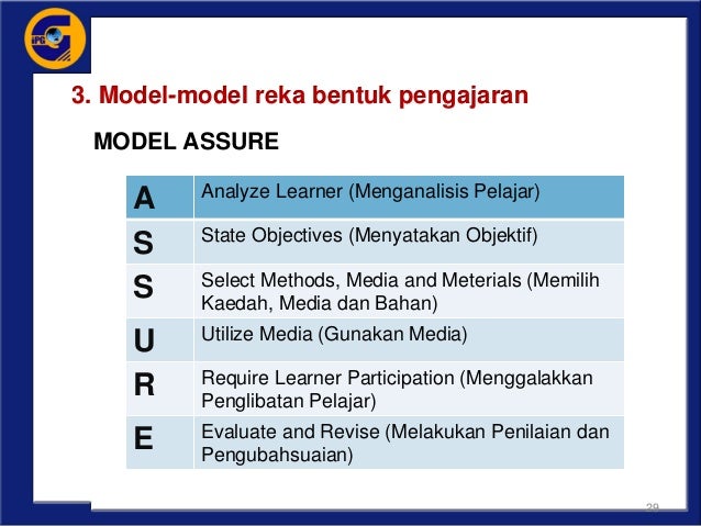 - 29. MODEL ASSURE 29 3. Model-model reka bentuk pengajaran A Analyze Learner (Menganalisis Pelajar) S State Objectives (Menyatakan Objektif) S Select Methods, Media and Meterials (Memilih Kaedah, Media dan Bahan) U Utilize Media (Gunakan Media) R Require Learner Participation (Menggalakkan Penglibatan Pelajar) E Evaluate and Revise (Melakukan Penilaian dan Pengubahsuaian)