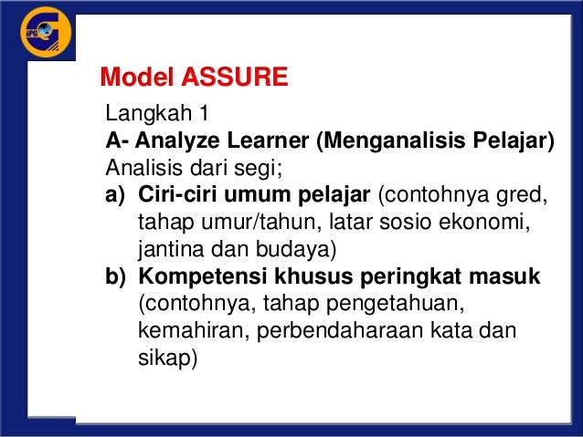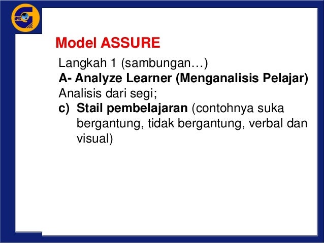 - 31. Langkah 1 (sambungan…) A- Analyze Learner (Menganalisis Pelajar) Analisis dari segi; c) Stail pembelajaran (contohnya suka bergantung, tidak bergantung, verbal dan visual) Model ASSURE