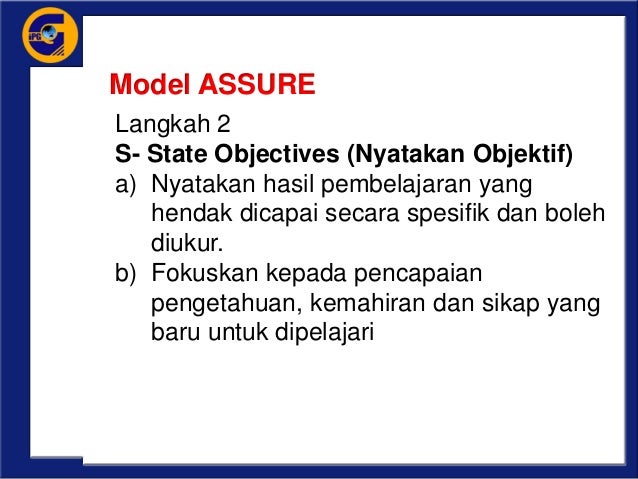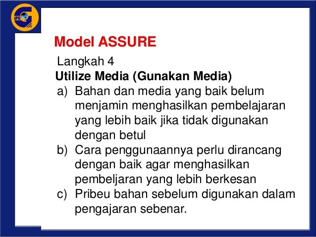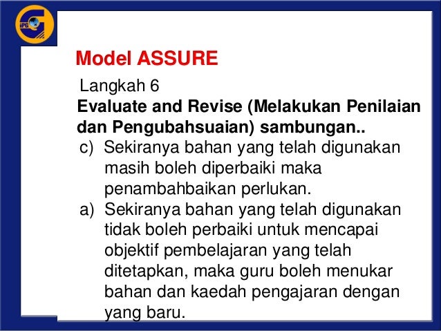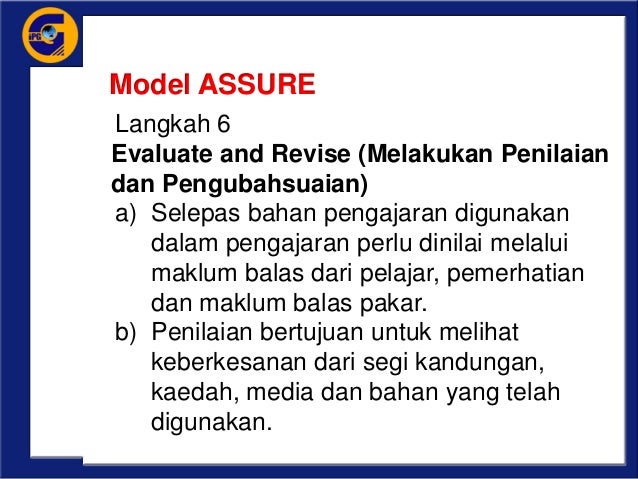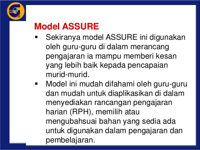 - 38. Sekiranya model ASSURE ini digunakan oleh guru-guru di dalam merancang pengajaran ia mampu memberi kesan yang lebih baik kepada pencapaian murid-murid. Model ini mudah difahami oleh guru-guru dan mudah untuk diaplikasikan di dalam menyediakan rancangan pengajaran harian (RPH), memilih atau mengubahsuai bahan yang sedia ada untuk digunakan dalam pengajaran dan pembelajaran. Model ASSURE