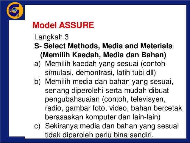 - 33. Langkah 3 S- Select Methods, Media and Meterials (Memilih Kaedah, Media dan Bahan) a) Memilih kaedah yang sesuai (contoh simulasi, demontrasi, latih tubi dll) b) Memilih media dan bahan yang sesuai, senang diperolehi serta mudah dibuat pengubahsuaian (contoh, televisyen, radio, gambar foto, video, bahan bercetak berasaskan komputer dan lain-lain) c) Sekiranya media dan bahan yang sesuai tidak diperoleh perlu bina sendiri. Model ASSURE