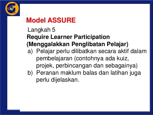 - 35. Langkah 5 Require Learner Participation (Menggalakkan Penglibatan Pelajar) a) Pelajar perlu dilibatkan secara aktif dalam pembelajaran (contohnya ada kuiz, projek, perbincangan dan sebagainya) b) Peranan maklum balas dan latihan juga perlu dijelaskan. Model ASSURE