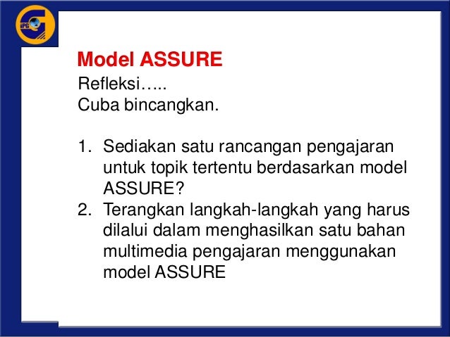 - 39. Refleksi….. Cuba bincangkan. 1. Sediakan satu rancangan pengajaran untuk topik tertentu berdasarkan model ASSURE? 2. Terangkan langkah-langkah yang harus dilalui dalam menghasilkan satu bahan multimedia pengajaran menggunakan model ASSURE Model ASSURE