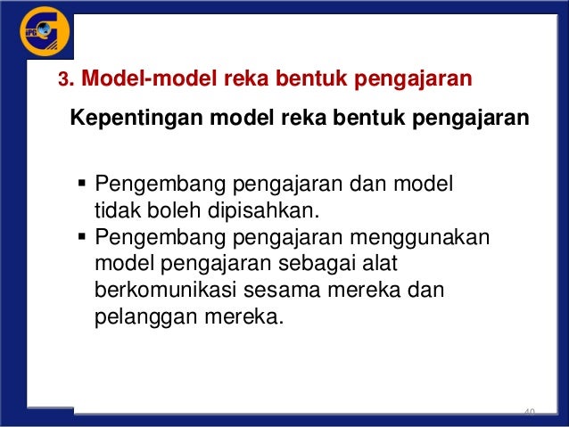 - 40. Kepentingan model reka bentuk pengajaran 40 3. Model-model reka bentuk pengajaran Pengembang pengajaran dan model tidak boleh dipisahkan. Pengembang pengajaran menggunakan model pengajaran sebagai alat berkomunikasi sesama mereka dan pelanggan mereka.