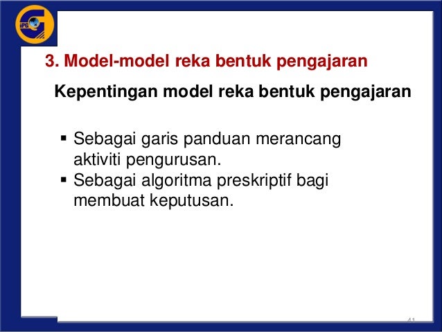 - 41. Kepentingan model reka bentuk pengajaran 41 3. Model-model reka bentuk pengajaran Sebagai garis panduan merancang aktiviti pengurusan. Sebagai algoritma preskriptif bagi membuat keputusan.