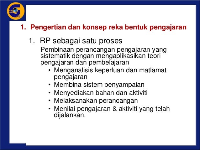 - 4. 1. Pengertian dan konsep reka bentuk pengajaran Reka Bentuk Pengajaran (RP): 1. Reka bentuk pengajaran adalah proses sistematik bagi menterjemahkan prinsip- prinsip umum suatu pengajaran dan pembelajaran kepada perancangan bagi menghasilkan bahan untuk pengajaran dan pembelajaran.